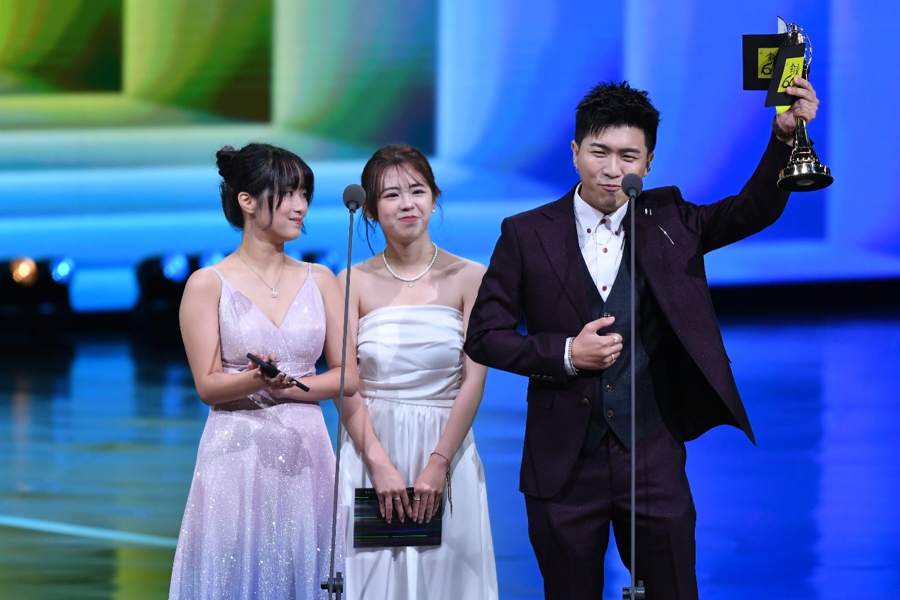 圖:吳宇軒團隊於第60屆金鐘獎獲獎(左起汪怡荃、盛寶欣、吳宇軒)